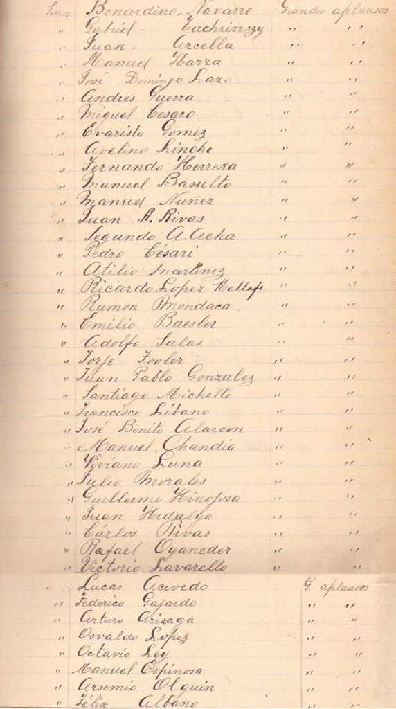 «Bernardino Navarro, Gabriel Zuchrinszy, Juan Arcella, Manuel Ibarra, José Domingo Lazo, Andrés Guerra, Miguel Cesaro, Evaristo Gómez, Avelino Linche, Fernando Herrrera, Manuel Basulto, Manuel Núñez, Juan A. Rivas, Segundo A. Acha, Pedro Césari, Atilio Martínez, Ricardo López Mellafe, Ramón Mondaca, Emilio Baesler, Adolfo Salas, Jorje Zovler,  Juan Pablo González, Santiago Michelle, Francisco Líbano, José Benito Alarcón, Manuel Chandía, Viviano Luna, Julio Morales, Guillermo Hinojosa, Juan Hidalgo, Carlos Rivas, Rafael Oyaneder, Victorio Lavarello, Lucas Acevedo, Federico Gajardo, Arturo Arisaga, Osvaldo López, Octavio Ley, Manuel Espinosa, Arsemio Olguín y Zélise Albano».