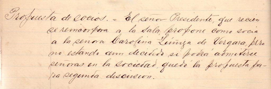 “El señor Presidente, que recién se reincorpora a la sala, propone como socia a la señora Carolina Zúñiga de Vergara, pero no estando aun decidido si podrá admitirse señoras en las sociedad, quedó la propuesta para segunda decisión”
