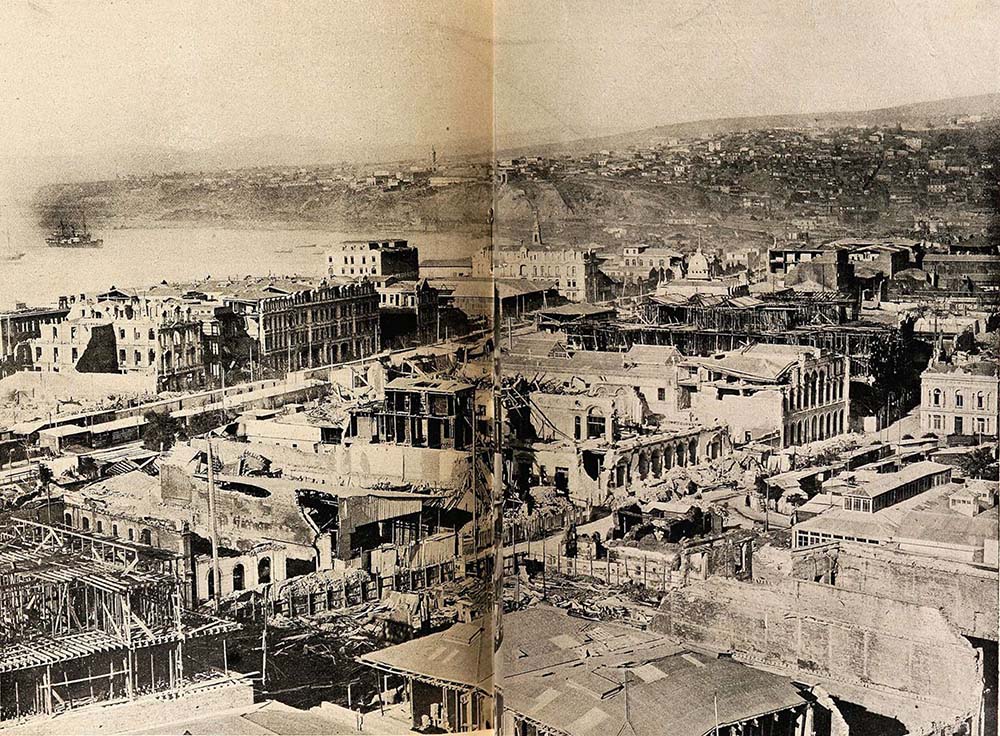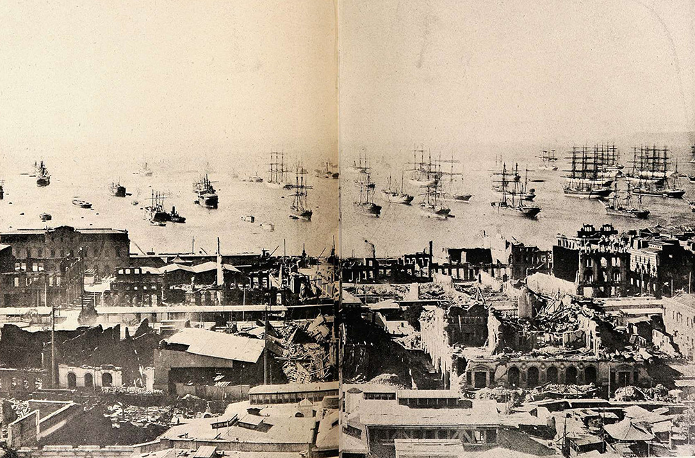 Panorámica de Valparaíso después del terremoto de 16 de agosto de 1906. Imagen restaurada y digitalizada de la vista publicada en Sucesos el 5 de octobre de 1906.