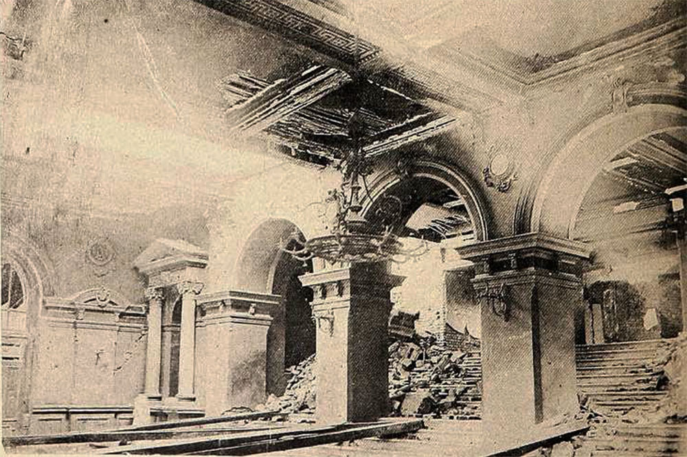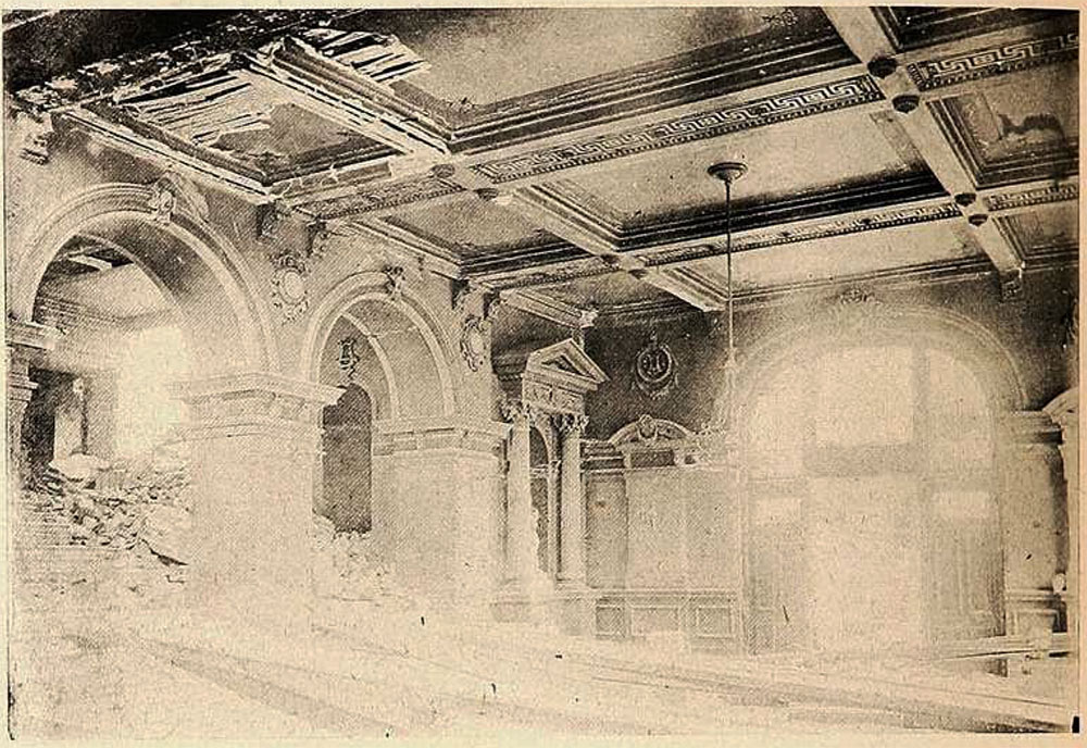 - Otra vista del foyer del Teatro Victoria después del terremoto que sacudió Valparaíso el 16 de agosto de 1906. Imagen restaurada y digitalizada de la vista publicada por Revista Sucesos el 2 de noviembre de 1906.
