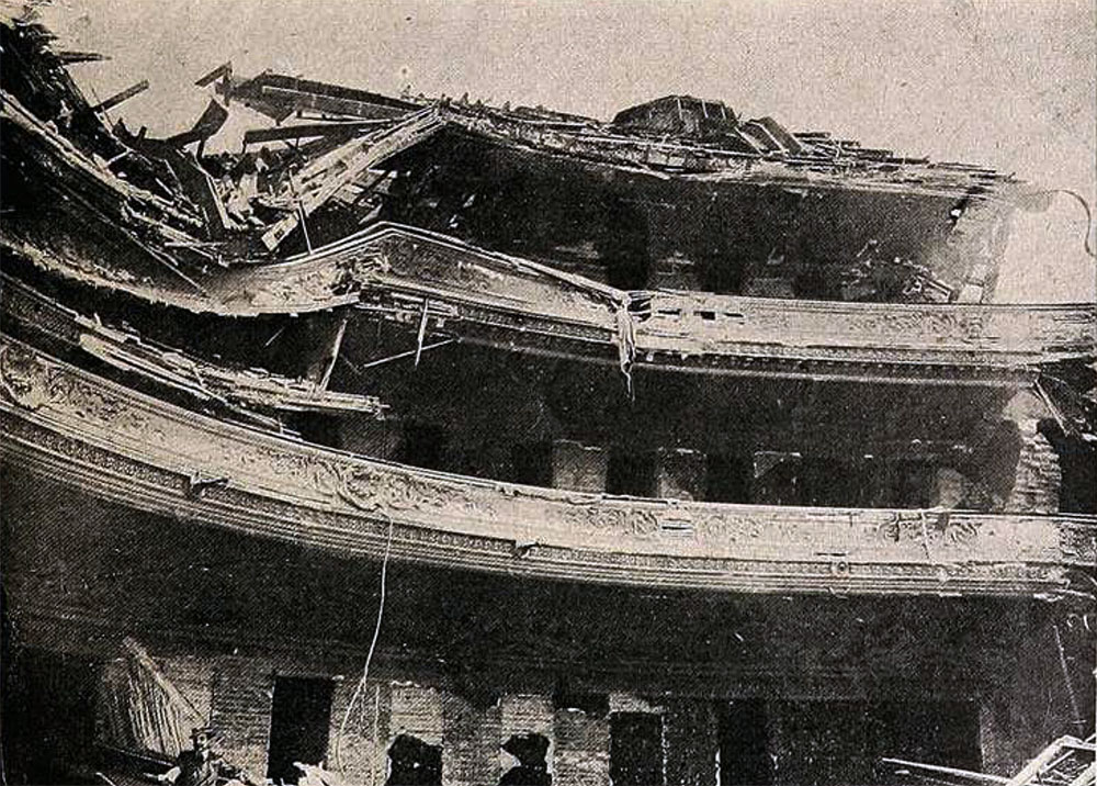 - La caída de las galterías sobre los palcos y éstos sobre la platea. Interior del Teatro Victoria después de terremoto de Valparaíso.