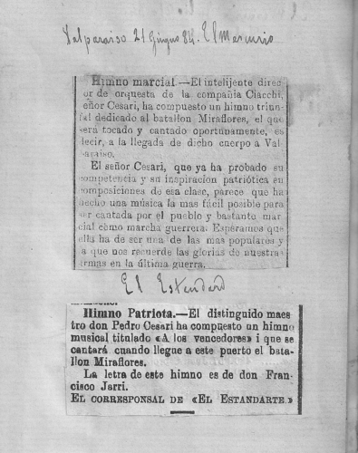 En la sociedad finisecular chilena el nacionalismo no se buscaba anclar en la diferencia con la tradición colonial española, sino que a nivel interno dentro del Conosur con los vecinos fronterizos, en donde los personajes y héroes de la Guerra del Pacífico fueron los protagonistas de este nuevo imaginario. Así lo señalan las noticias que destacan la contribución de Cesari quien “ya ha probado su competencia y su inspiración patriótica en composiciones de esa clase” (CR116). Lamentablemente, no tenemos registro escrito de la obra musical, sin embargo, en la misma nota citada la describen como una pieza “marcial como marcha guerrera” y que se espera que sea cantada por el pueblo (CR116).