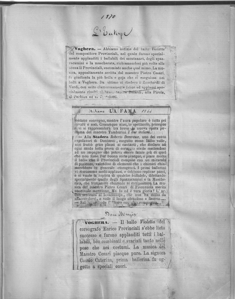 – Alla Stadera Roberto Devereux, uno dei cento capolavori di Donizetti, eseguito come Iddio volle, non fruttò gran plausi ai cantanti, che diedero ad ogni modo bella prova di caroggo civile mettendosi ad un impegno che poteva essere fatale più di quel che non fosse. Per buona sorte piacque, e piace molto il ballo che il Provinciali compose con un miracolo di pazienza, valendosi di elementi che in chimici chiamerebbero in generale eterogenei. I primi ballerini vi riscuotono molti applausi e debbono replicar passi e si vuole la replica di qualche ballabile, dilettando specialmente quello deglo Spazzacamini e la Mascherata, che fruttarono chiamate al compositore. La musica del maestro Pietro Cesari di Firenzuola merita onoverole menzione. Ma fu ed è vera gloria? L’ ardua sentenza al bolletinajo, che non ha molto da affaccerdarse, e vede il luogo silenzioso e deserto…